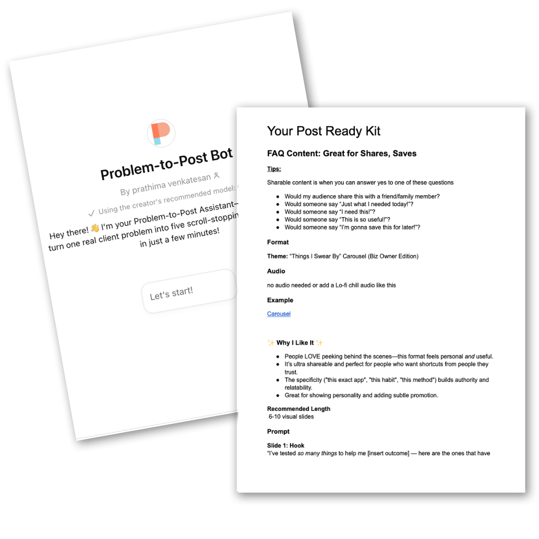 The Post-Ready Kit helps you go from “idea” to “caption written” in 15 minutes or less—with fill-in-the-blank prompts and your own AI content coach (aka the tool that helps you stop second-guessing your message).
